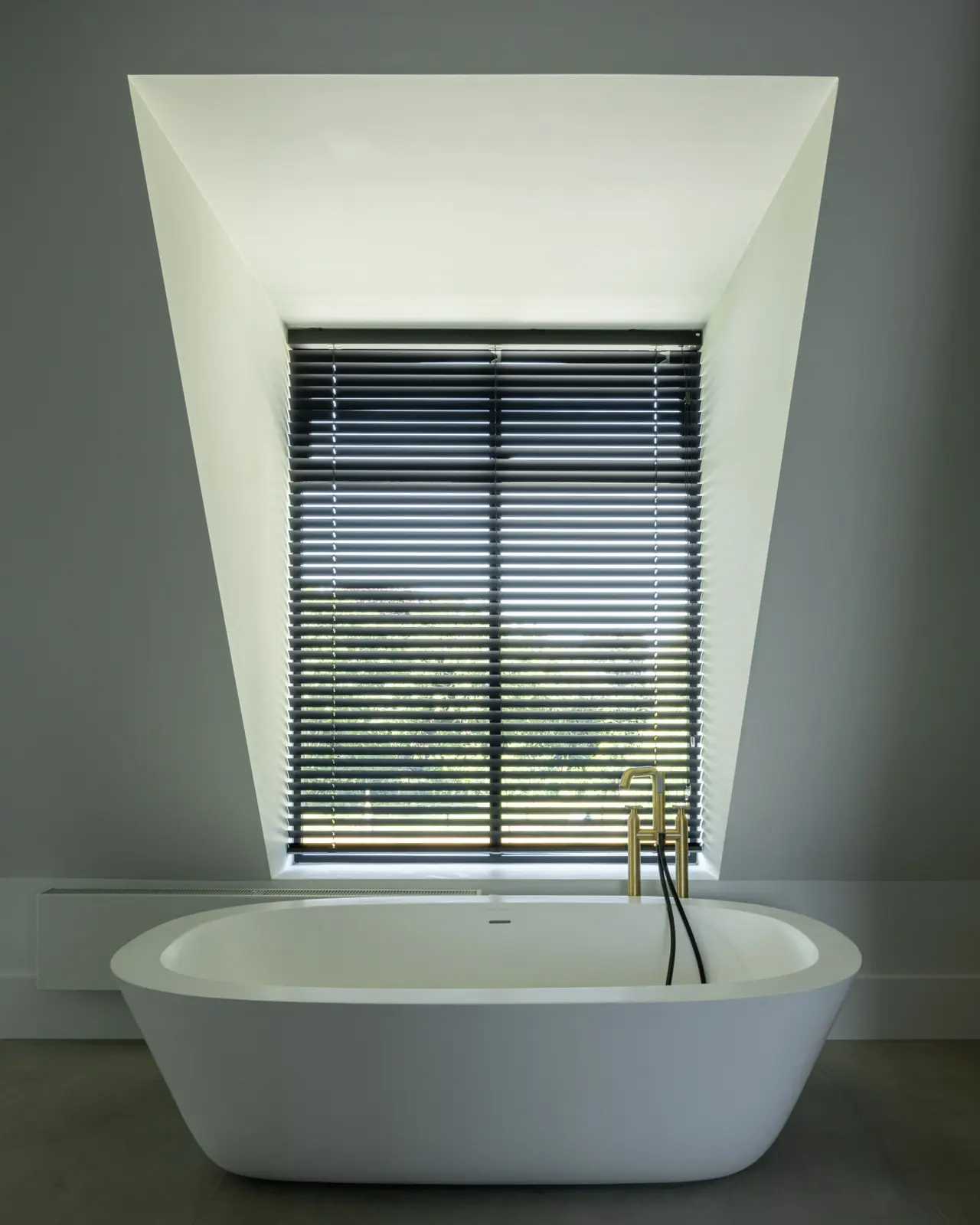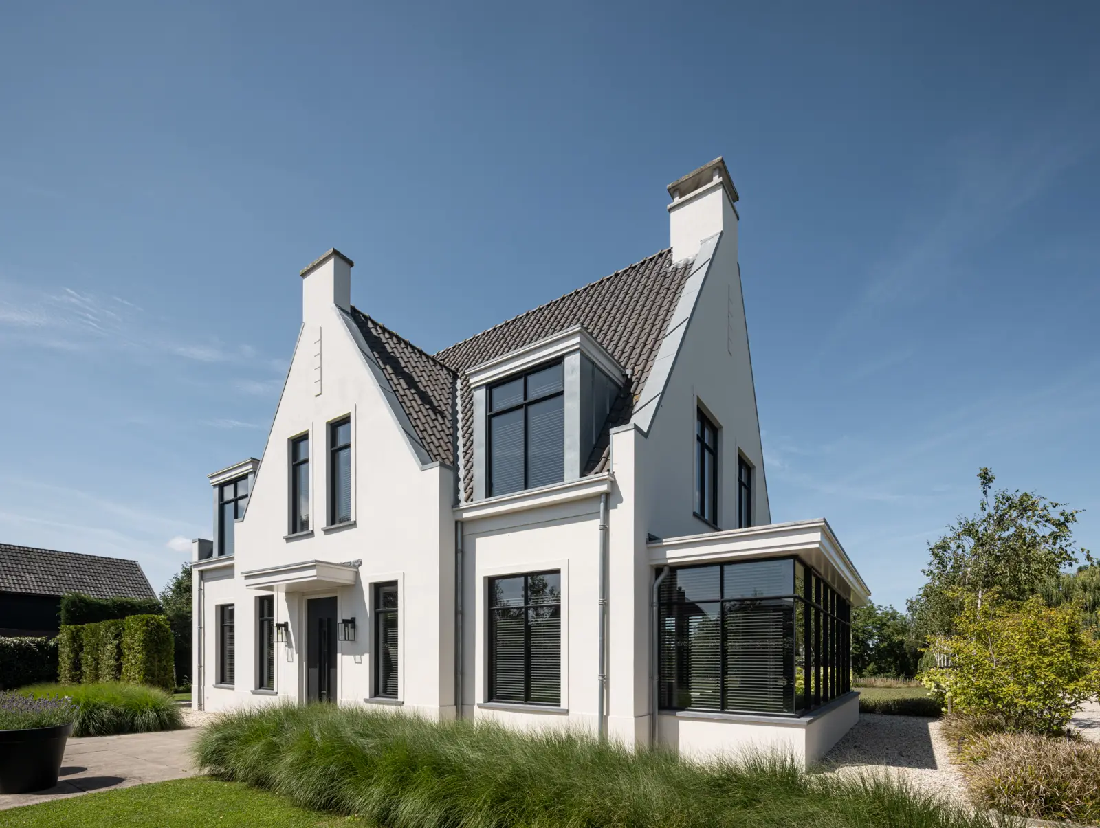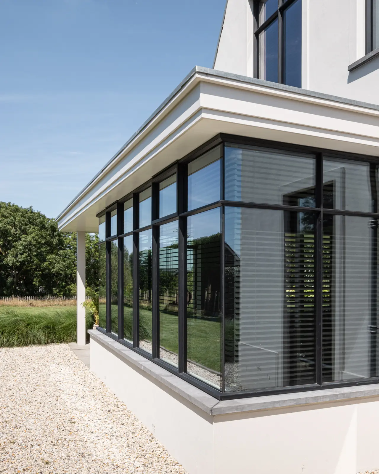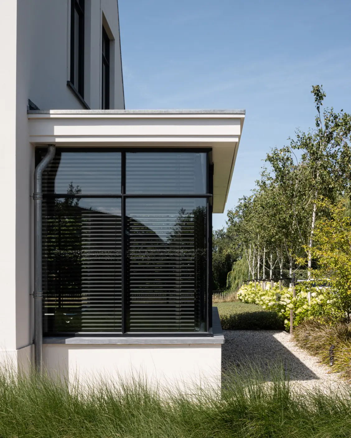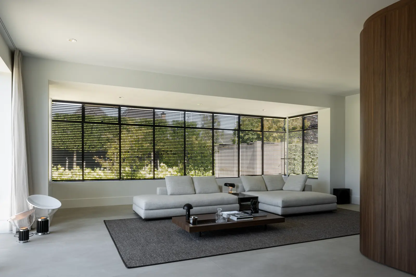 Om de strakke uitstraling van de woning te benadrukken, plaatsten we zwarte aluminium jaloezieën. Deze zorgen voor optimale lichtregulering en geven het geheel een modern, architectonisch karakter. De combinatie van de jaloezieën met de strakke kozijnen van deze woning vormen een mooi geheel.
